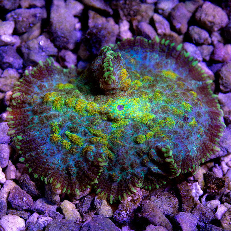 Size: ~1" loose polyp. We keep our mushrooms on Caribsea Florida Crushed Coral (Geo Marine old school 3-5 mm grain size) to prevent growing on eggcrate. We ship the polyps loose with substrate grains attached to foot. If requested, we're happy to mount to plugs at no additional charge prior to shipping.